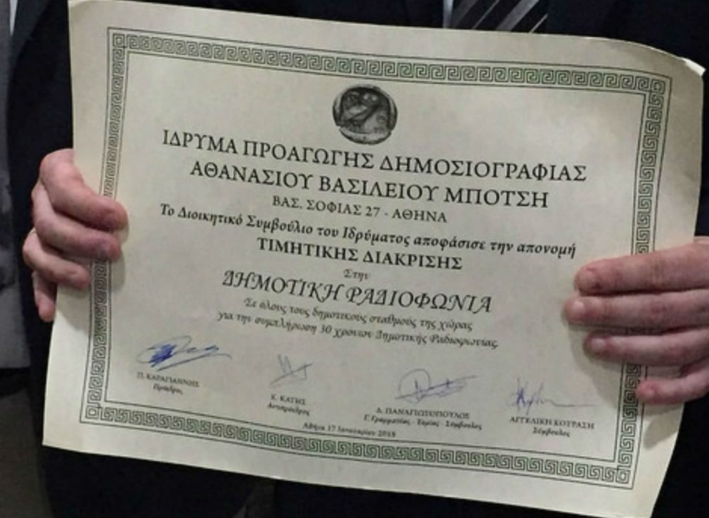 Σε μια λιτή τελετή στην κατάμεστη αίθουσα του Μεγάρου της Παλαιάς Βουλής, παρουσία του Προέδρου της Δημοκρατίας, Προκόπη Παυλόπουλου, έγινε η απονομή των 34ων Βραβείων Προαγωγής Δημοσιογραφίας του Ιδρύματος Αθ. Μπότση, όπου απονεμήθηκε τιμητική διάκριση στην Δημοτική Ραδιοφωνία.